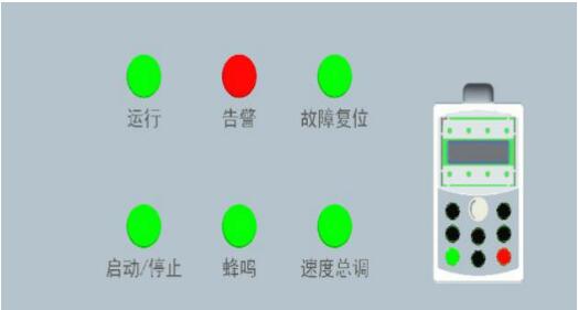 控制面板有啟動/停止旋鈕,速度調(diào)節(jié)旋鈕,變頻器顯示和設(shè)置小面板,還包括運行、蜂鳴、告警指示燈,*作簡單。
